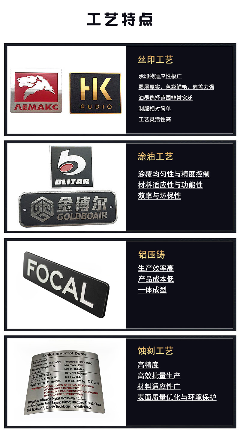 不銹鋼金屬標牌適用于工業制造與機械行業、電子與電器行業、汽車與交通運輸行業、醫療與制藥行業、建筑與裝飾行業、軍工與安防行業、奢侈品與禮品行業。其核心優勢在于適應惡劣環境、信息持久清晰、兼具功能性與裝飾性,因此在對標識耐用性、精度或美觀度有高要求的行業中均能發揮重要作用。